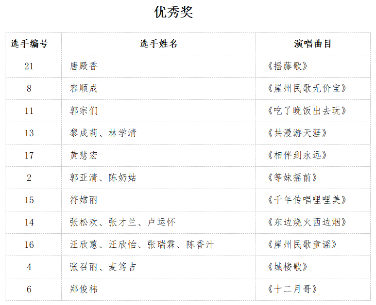 决赛现场,经评委会严格评审并报大赛组委会审核通过,共评选出原生态民歌组与新民歌组的一、二、三等奖及多个单项奖。现将全部奖项公布如下,并向获奖选手和单位致以最诚挚的祝贺!
